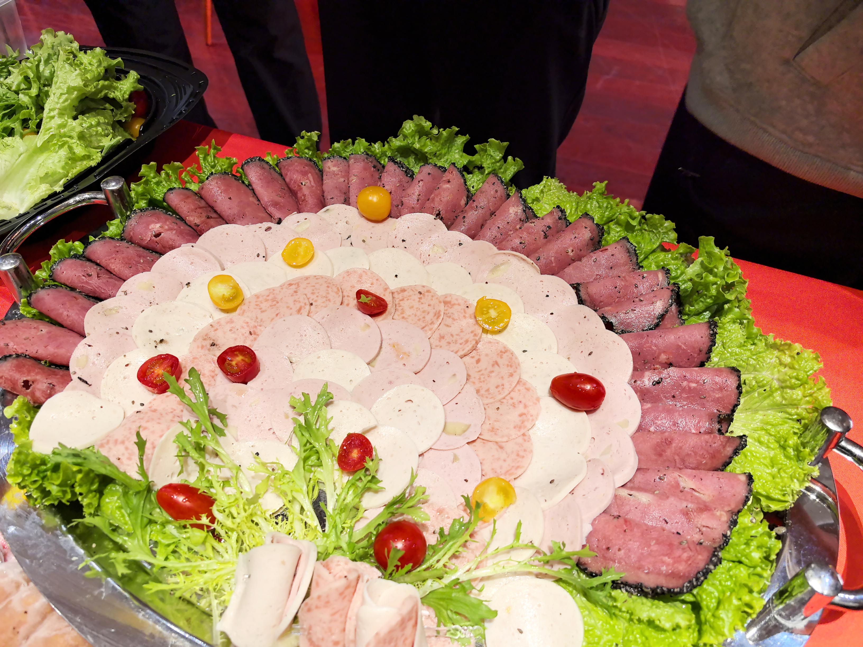 精心準(zhǔn)備的精制培根切片拼盤,肉質(zhì)鮮嫩,咸香適口;德式香腸拼盤更是誠(chéng)意滿滿,瑞士雞肉烤腸的鮮嫩、圖林根香腸的醇厚、德式香蔥油煎盤腸的鮮香、小牛腸的細(xì)膩,每一款都讓人回味無(wú)窮;冷切拼盤里,蘑菇里昂那的獨(dú)特風(fēng)味、黑椒牛肉切片的緊實(shí)口感、雞肉冷切腸的 Q 彈,滿足了不同嘉賓的味蕾偏好;還有經(jīng)典的德式脆皮豬肘,外皮酥脆,內(nèi)里肉質(zhì)軟爛多汁,一上桌就吸引了眾人目光,贏得陣陣好評(píng)!